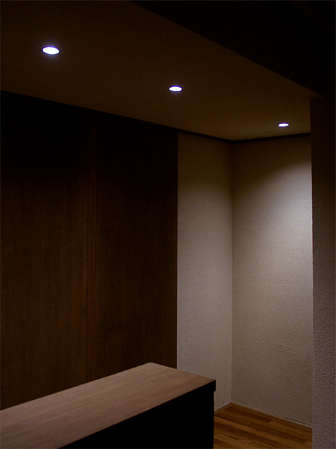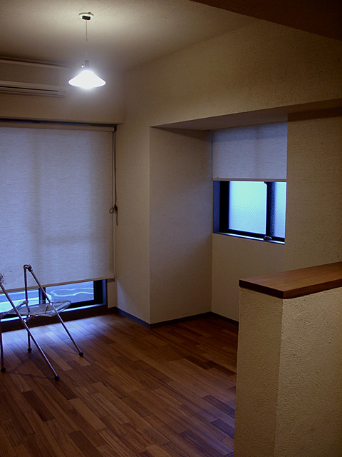 | ここは玄関と一体化した部屋になっていて、必要に応じてロールスクリーンで間仕切らる、いろいろな目的で使える部屋になっています。 室内の床仕上はチーク無垢のフローリング。 壁や天井は珪藻土左官仕上です。 |
