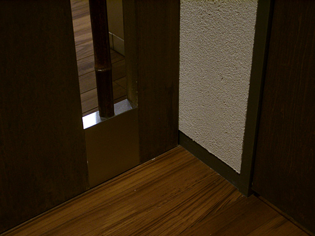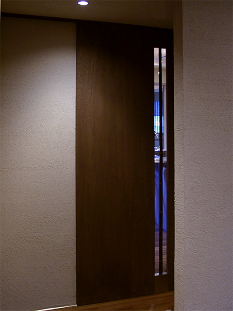 | 玄関左手の壁面は一面板張りになっていて、下駄箱であったり傘収納であったり洗面所への入口であったりします。 |